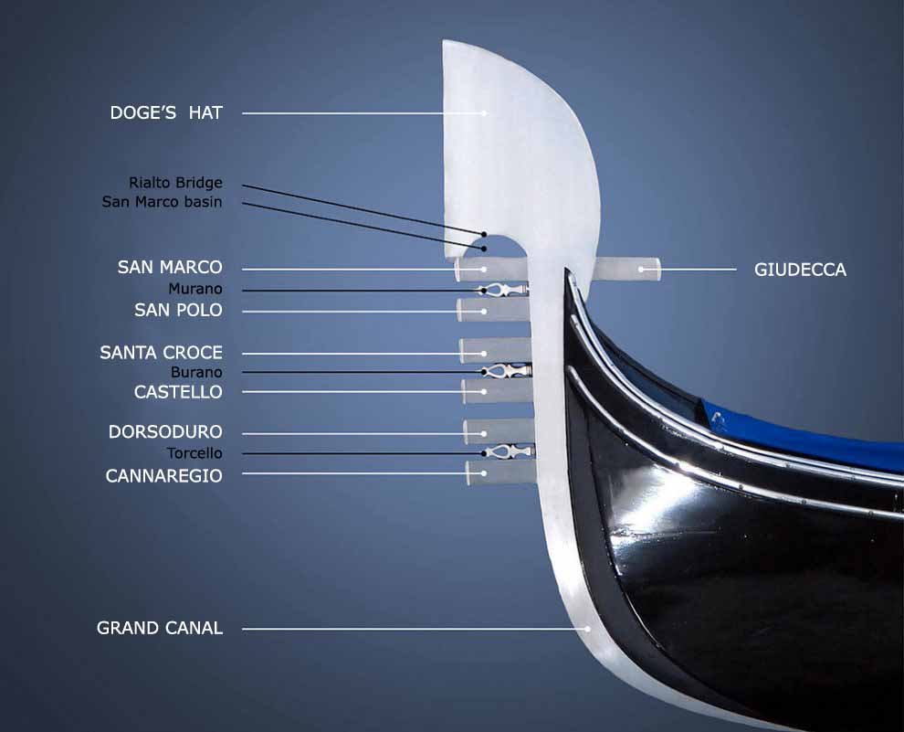 The islands of Murano, Burano and Torcello are displayed within the six Pettini. A curious thing is that the top of the Ferro di Prora symbolises the Doge’s hat, whereas the space between its bottom and the first Pettine symbolises both the Rialto Bridge and St. Mark’s Basin. Last but not least, the very bottom of the iron bow symbolises the Grand Canal.